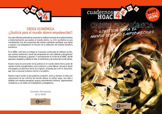 Ediciones HOAC acaba de editar el cuaderno nº 4, con el título “CRISIS ECONÓMICA. ¡Justicia para el mundo obrero empobrecido!”. Una reflexión que presenta la realidad de creciente empobrecimiento y deshumanización en el mundo obrero. “La crisis económica es una manifestación más de la expansión del sistema capitalista neoliberal, que utiliza y explota a los trabajadores en función de la obtención del máximo beneficio económico”.