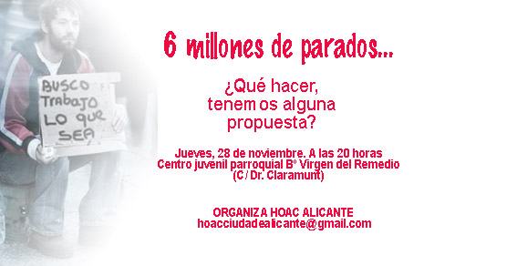 El jueves, 28 de noviembre, a las 20 horas, en el Centro juvenil parroquial Bº Virgen del Remedio (C/ Dr. Claramunt, Alicante), se celebra una mesa redonda, organizada por la HOAC de Orihuela-Alicante en torno a la insoportable situación de desempleo que viven unos seis millones de personas en nuestro país.