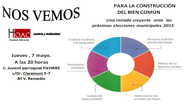 La HOAC de Alicante organiza una charla para reflexionar sobre las próximas elecciones municipales desde una mirada creyente. Será el jueves 7 de mayo a las 20:00 horas en el Centro Juvenil parroquial Pavirre, en la calle Dr. Claramunt 5-7, en el Barrio V. Remedio, Alicante.
