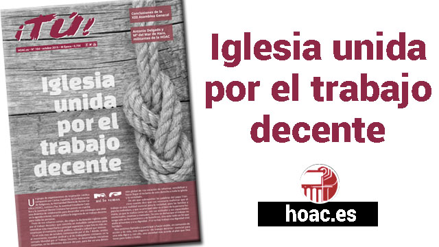 Un grupo de organizaciones de inspiración católica, entre las que se incluye la HOAC, ha iniciado una colaboración para poner el trabajo decente en la agenda eclesial, dando origen a la declaración «Iglesia unida por el trabajo decente», titular que abre la portada de este número del ¡TÚ!