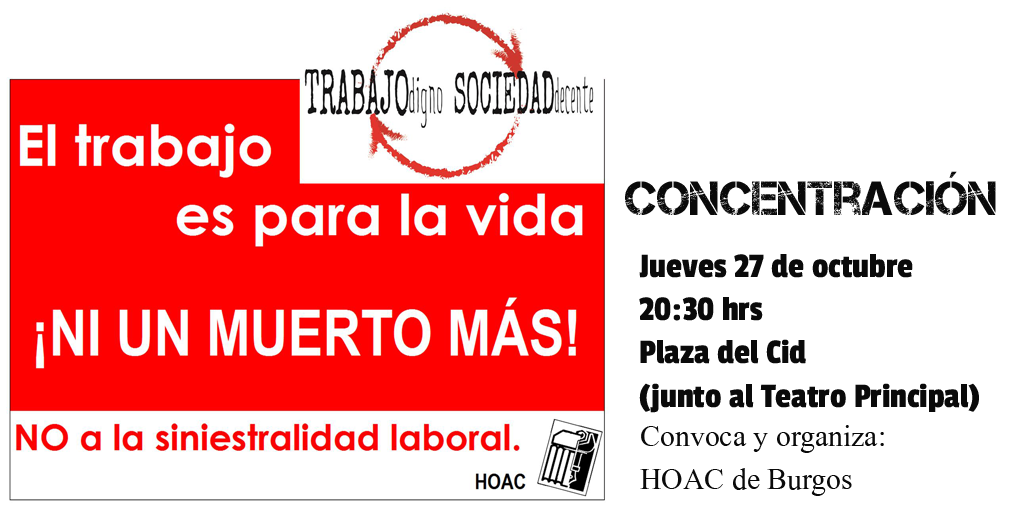 La Hermandad Obrera de Acción Católica (HOAC) de Burgos, al hilo de su campaña “TRABAJO DIGNO para una SOCIEDAD DECENTE”, y con motivo de los acontecimientos que han costado la vida a dos trabajadores relacionados con la provincia, convoca una concentración para solidarizarse con los trabajadores que han sufrido accidentes de trabajo, sus familias y el resto de las víctimas. También queremos llamar la atención de instituciones públicas, empresas y sociedad en general sobre la gravedad de estos sucesos en cuya erradicación todos estamos implicados.