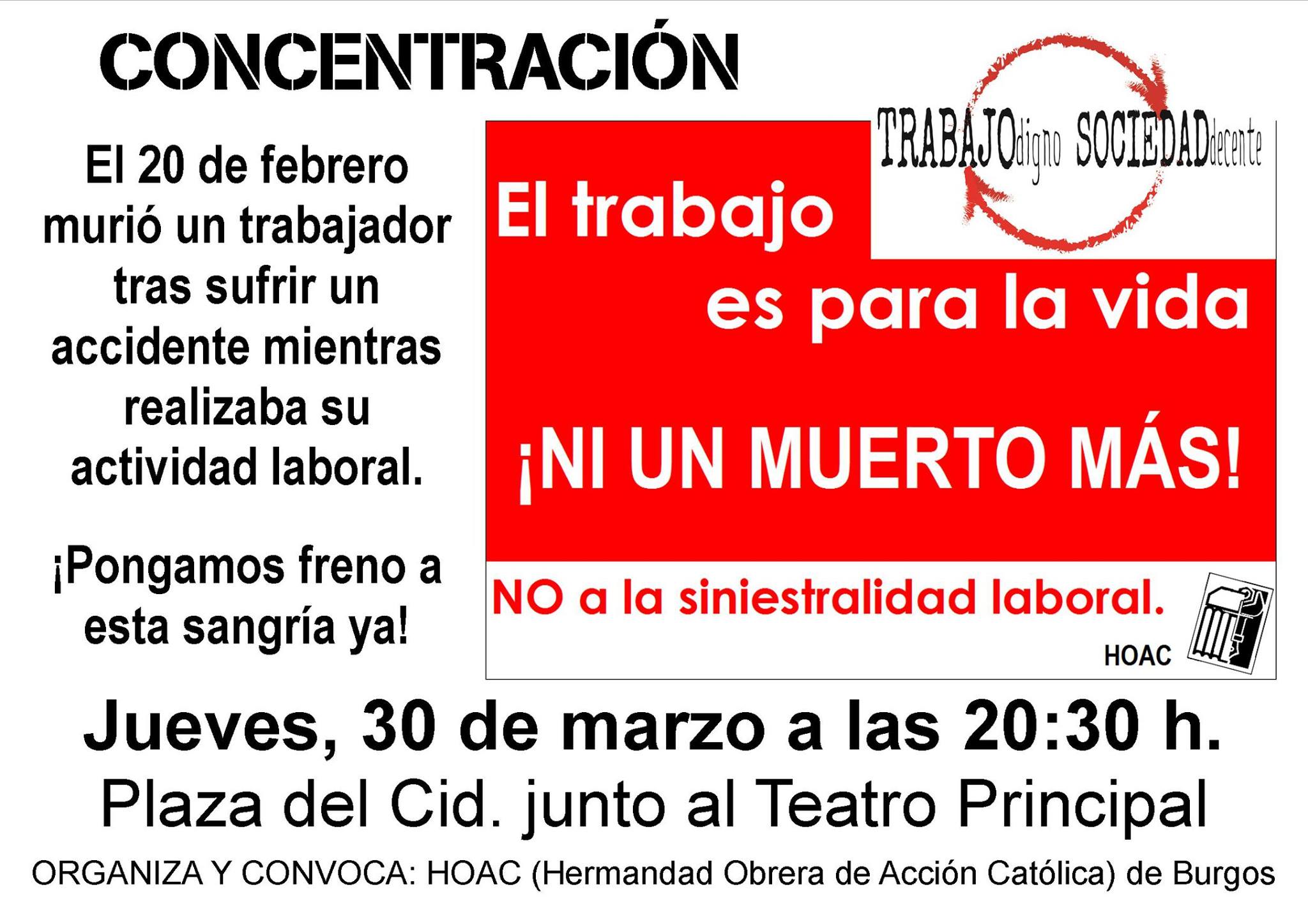La HOAC de Burgos organiza una concentración el jueves, 30 de marzo a las 20:30 horas en la Plaza del Cid (junto al Teatro Principal), para tener presente al trabajador fallecido en accidente laboral el pasado 20 de febrero en la localidad de Fuentespina y seguir clamando contra esta lacra que afecta al mundo del trabajo.