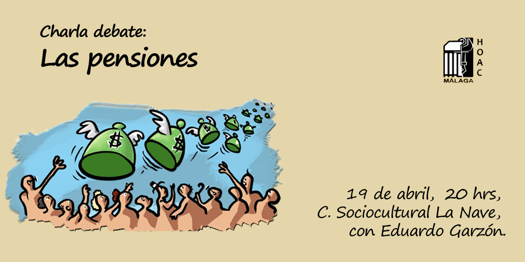 El sector de precariedad de la HOAC de Málaga organiza una charla-debate para reflexionar sobre la situación de las pensiones y hacer propuestas de actuación desde el ser Iglesia para la Pastoral Obrera, el jueves 19 de abril, a las 20 hrs, en el Centro sociocultural La Nave, con la participación de Eduardo Garzón.