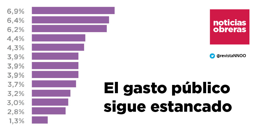 Es habitual que el presupuesto se incremente año tras año. Pero pese al incremento, en términos absolutos, del gasto público, es menor que el del PIB nominal, lo que significa que supondrá el 40,5% del PIB, el dato más bajo desde el año 2007. Una muestra de que la supuesta recuperación económica e incremento de la riqueza no se refleja en un mayor gasto público, perpetuando la pobreza y desigualdad tan elevadas que sufre nuestro país.
