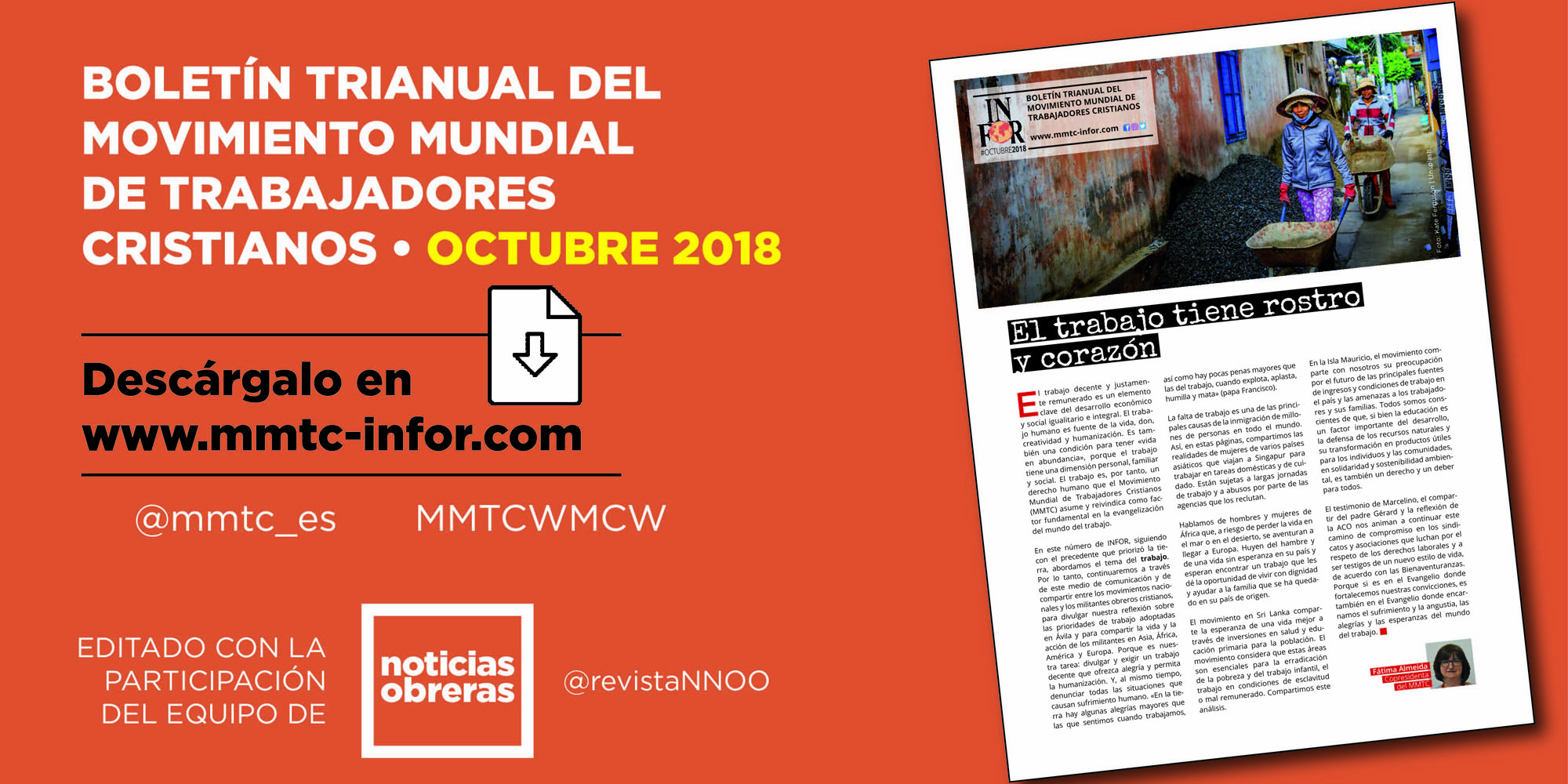 Presento los contenidos de un nuevo número del boletín informativo INFOR, editado por el Movimiento Mundial de Trabajadores Cristianos (MMTC). Este es el número de octubre de la nueva etapa, con el trabajo como tema central (recordamos que los contenidos del INFOR a partir de este año 2018 van a estar dedicados al eje de las 3T: tierra, techo y trabajo).
