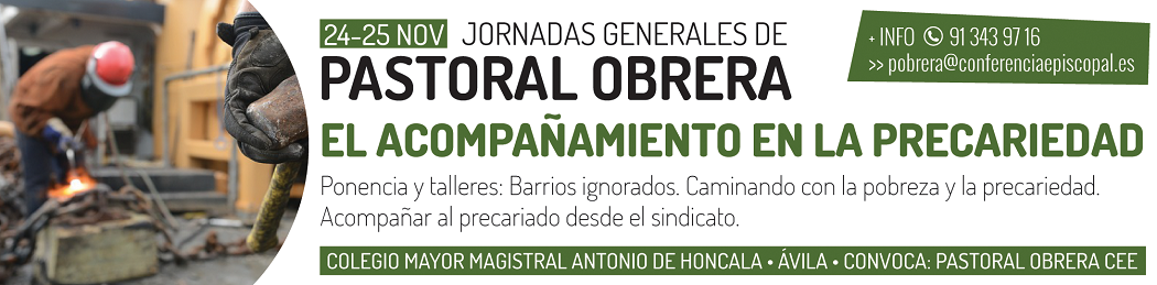 Convocadas las XXIV Jornadas Generales de Pastoral Obrera, con el lema «Acompañar en la precariedad» que organiza el departamento de Pastoral Obrera de la Conferencia Episcopal Española, durante los días 23, 24 y 25 de noviembre, en el Colegio Mayor Magistral Antonio de Honcala (Seminario) de Ávila (Av. de la Inmaculada 9).