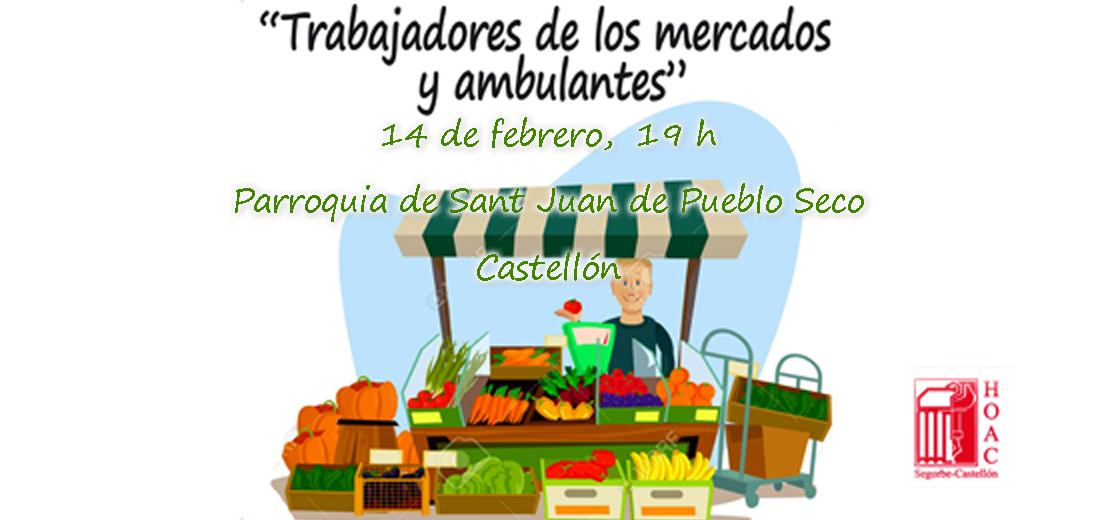 La HOAC de Segorbe-Castellón ha convocado una nueva Trobada, en este caso, dedicada a los “Trabajadores de los mercados y ambulantes”, el 14 de febrero, a las 19 h en los salones de la Parroquia de Sant Juan de Pueblo Seco de Castellón, con el objetivo de acercar y visibilizar la realidad laboral de los trabajadores y trabajadoras de este sector. Para ello, se compartirá el testimonio de diversas personas trabajadoras hablarán de su experiencia y de cómo suscondiciones laborales afectan a su vida personal, familiar y social.