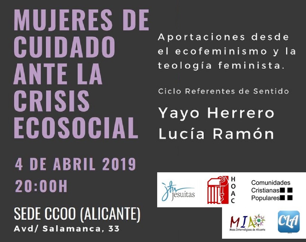 La HOAC de Alicante, junto con Jesuitas, la Mesa Interreligiosa de Alicante y las Comunidades Cristianas Populares, organizan el Ciclo referentes con sentido. En un primer encuentro, se plantea realizar un diálogo de aportaciones desde el ecofeminismo y la teología feminista bajo el título Mujeres de cuidado ante la crisis ecosocial. Contará con las voces de Yayo Herrero, antropóloga y activista feminista; y con la filósofa y teóloga Lucía Ramón, ambas colaboradoras de la revista Noticias Obreras. El acto público será el jueves 4 de abril a las 20h. en el salón de actos del sindicato Comisiones Obreras en Alicante (Avda. Salamanca, 33).