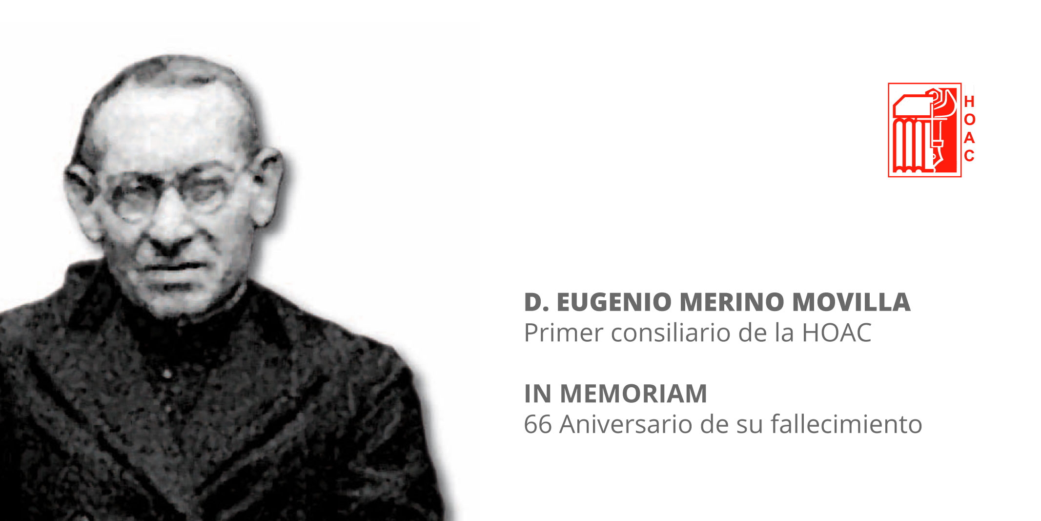 Hoy, 8 de abril, se cumple el 66º aniversario del fallecimiento de nuestro primer consiliario general, don Eugenio Merino Movilla. Un hombre anciano, apartado de toda tarea, de dinamismo escaso, y casi ciego que nadie podría sospechar que pudiera ser aliento de la vida y misión de la HOAC. Él fue quien puso los cimientos de nuestra mística y de nuestra espiritualidad y quien hizo posible, junto con Guillermo Rovirosa, el inicio de la andadura de la que cumpliremos 75 años cuando celebremos la próxima Asamblea General, prevista para agosto de 2021.