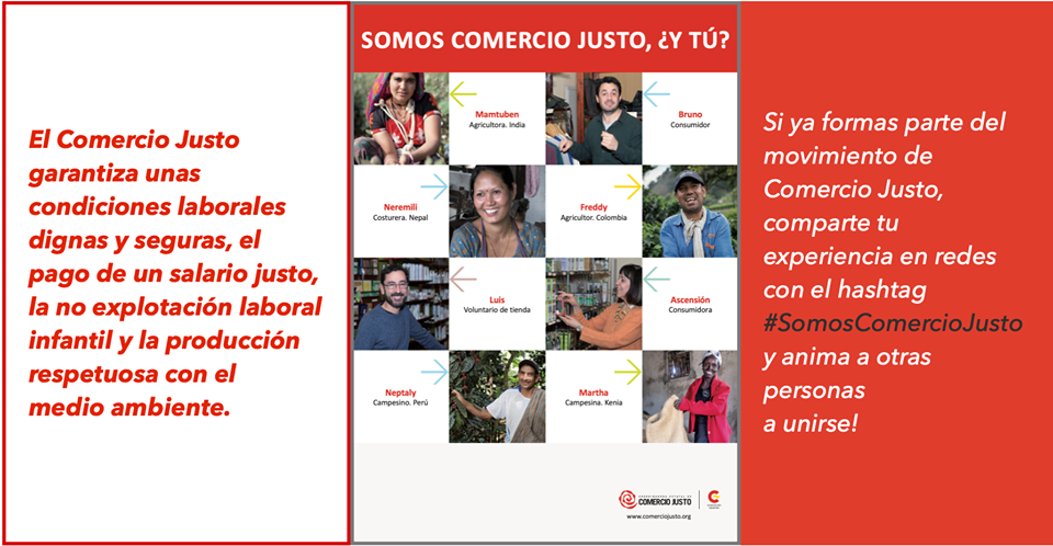 Con motivo del Día Mundial del Comercio Justo, 11 de mayo, las organizaciones que promueven otro modelo comercial, basado en el respeto a unas condiciones laborales dignas, igualdad salarial entre hombres y mujeres, la no explotación infantil y la protección del medio ambiente, organizan diversos actos de sensibilización en 50 localidades españolas, bajo el lema “Somos Comercio Justo, ¿y tú?”.