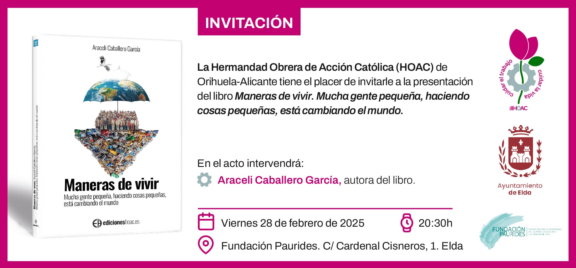 El viernes 28 de febrero, a las 20:30 h, la Hermandad Obrera de Acción Católica (HOAC) presenta en un acto público el libro Maneras de vivir. Mucha gente pequeña, haciendo cosas pequeñas, está cambiando el mundo (Ediciones HOAC, 2024), de Araceli Caballero. Será en la Fundación Paurides, C/ Cardenal Cisneros, 1. Elda (mapa). Con la colaboración del Ayuntamiento de Elda.